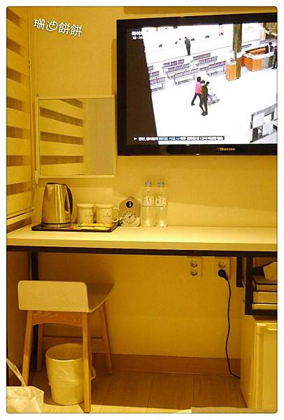 上方有電視 桌子下方有個椅子跟小垃圾桶